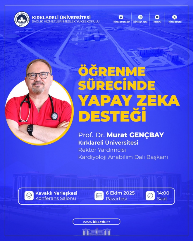 Kavaklı Yerleşkesi konferans salonunda 6 Ekim 2025 Pazartesi Günü saat 14:00'de Üniversitemiz Rektör Yardımcısı Prof. Dr. Murat GENÇBAY tarafından "Öğrenme Sürecinde Yapay Zeka Desteği" konulu seminer gerçekleştirilecektir.