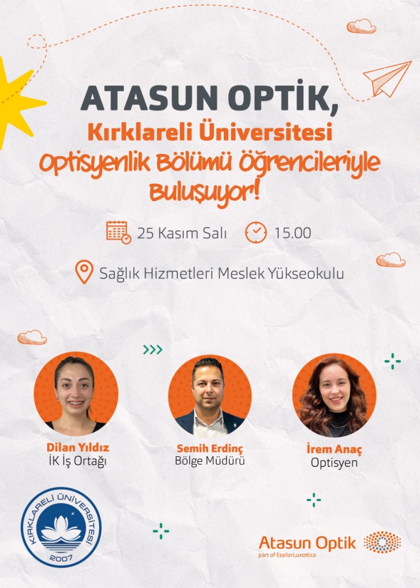 Atasun optik kariyer fırsatları, staj imkanları, optisyenlik mesleği ile igili; 25 Kasım 2025 saat 15:00'te, Semih ERDİNÇ (Bölge Müdürü) Dilan YILDIZ (İK İş Ortağı) İrem ANAÇ (Optisyen) tarafından bilgilendirme semineri yapılacaktır. Optisyenlik öğrencilerimize duyurulur.