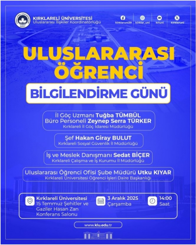 Kırklareli Üniversitesi Uluslararası İlişkiler Koordinatörlüğü tarafından, üniversitemizde öğrenim gören uluslararası öğrencilerin Türkiye’deki yasal yükümlülükleri, sosyal güvenlik hakları ve üniversite içi süreçler hakkında bilgilendirilmesini amaçlayan “Uluslararası Öğrenci Bilgilendirme Günü” düzenlenecektir. “Uluslararası Öğrenci Bilgilendirme Günü” etkinliği 03 Aralık 2025 Çarşamba günü saat 14.00’te Hasan Zan Konferans Salonu’nda gerçekleştirilecektir.