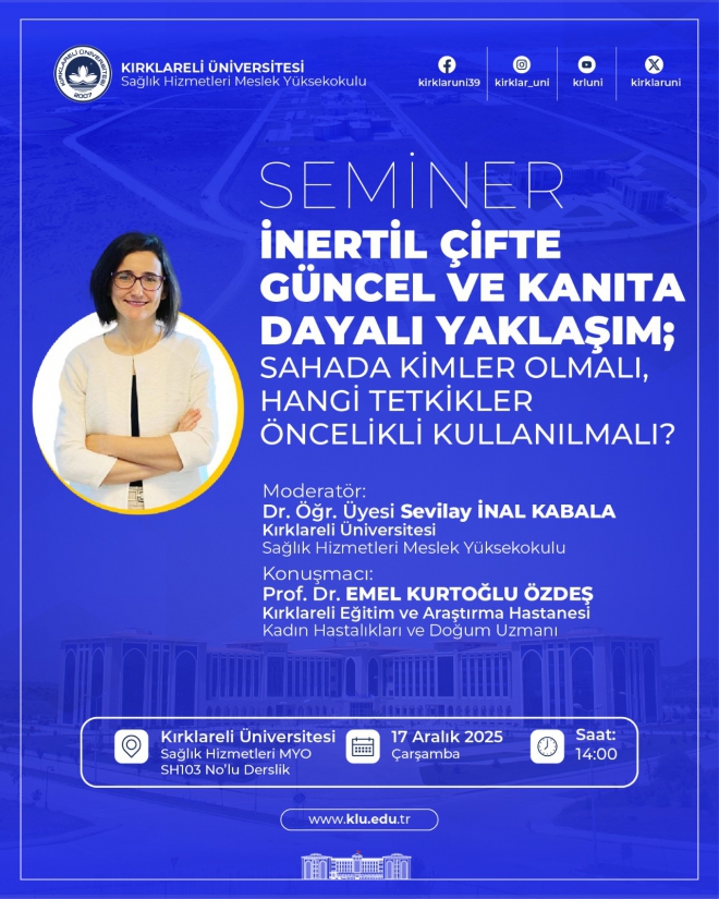 Sağlık Hizmetleri Meslek Yüksekokulu’ndan Dr. Öğr. Üyesi Sevilay İnal Kabala’nın moderatörlüğünde gerçekleştirelecek seminerde Kırklareli Eğitim ve Araştırma Hastanesi Kadın Hastalıkları ve Doğum Uzmanı Prof. Dr. Emel Kurtoğlu Özdeş, konuşmacı olarak bilgi ve deneyimlerini paylaşacaktır.
