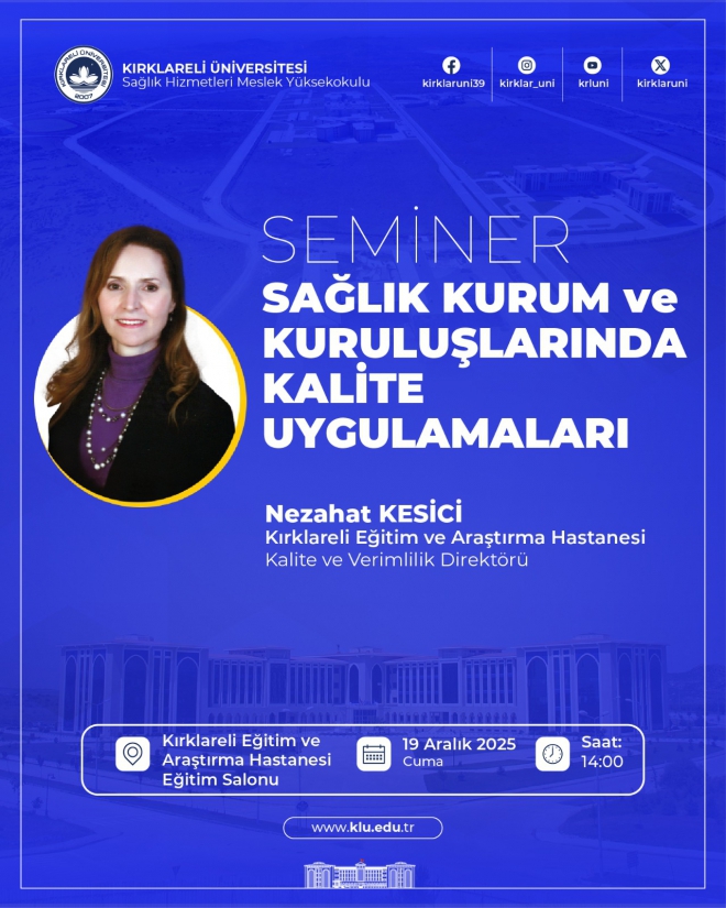 Üniversitemiz Sağlık Hizmetleri Meslek Yüksek Okulu tarafından, 19 Aralık 2025 Cuma 14.00’te Kırklareli Eğitim ve Araştırma Hastanesi Kalite ve Verimlilik Direktörü Nezahat Kesici’nin konuşmacı olarak yer alacağı “Sağlık Kurum ve Kuruluşlarında Kalite Uygulamaları” konu başlıklı seminer gerçekleştirilecektir.