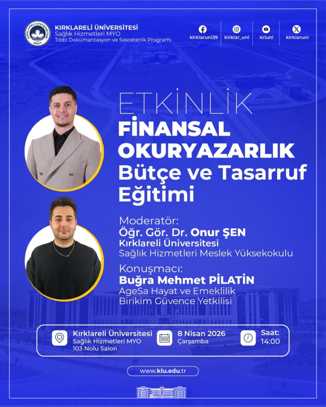 Üniversitemiz bünyesinde, öğrencilerin finansal bilinç düzeylerinin artırılması ve bütçe yönetimi konusunda farkındalık oluşturulması amacıyla “Finansal Okuryazarlık: Bütçe ve Tasarruf Eğitimi” başlıklı etkinlik düzenlenecektir.