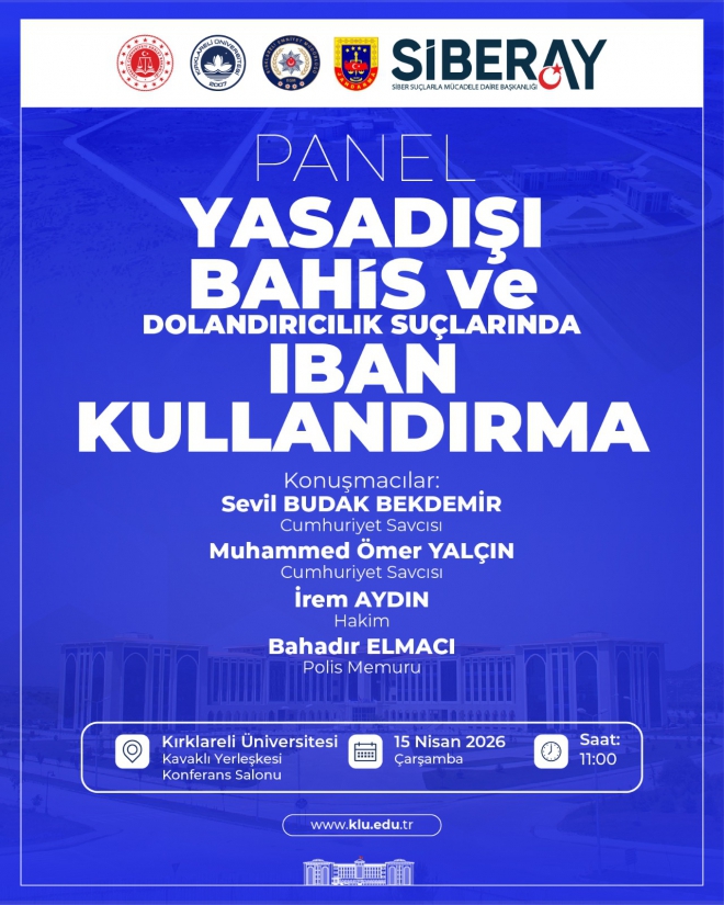 Üniversitemiz Kavaklı Kampüsünde yasadışı bahis ve dolandırıcılık suçlarında IBAN kullandırma konusuna yönelik farkındalık oluşturmak amacıyla “Yasadışı Bahis ve Dolandırıcılık Suçlarında IBAN Kullandırma” başlıklı panel düzenlenecektir.