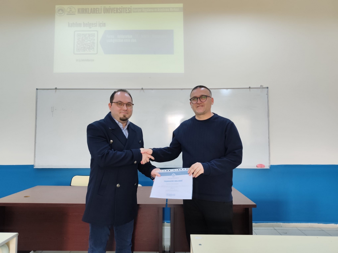 Etkinliğin sonunda, konuşmacı Öğr. Gör. İskender ÖZATLI'ya Sağlık Hizmetleri Meslek Yüksekokulu Müdür Yardımcısı Dr. Öğr. Üyesi Yasin YILMAZTÜRK tarafından teşekkür belgesi takdim edilmiştir.